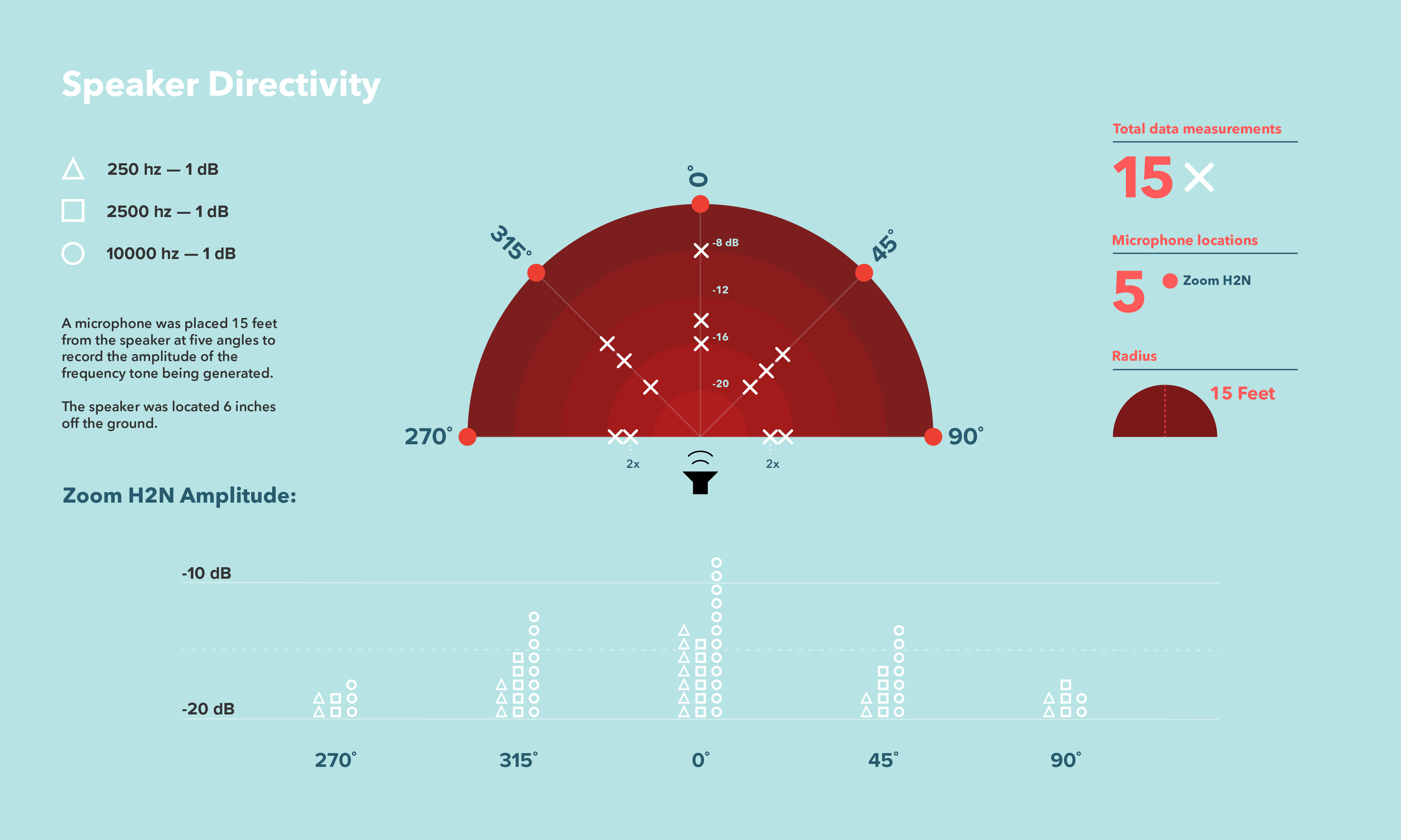 Directivity is the measure of how directional a source is — in other words, how good the loudspeaker is of transmitting sound at a specific direction. The final performance results indicate, as expected, that the speaker is more directional at higher frequencies. Sounds were produced using a frequency tone generator source at constant amplitude and recorded at five angles using a Zoom H2N microphone.